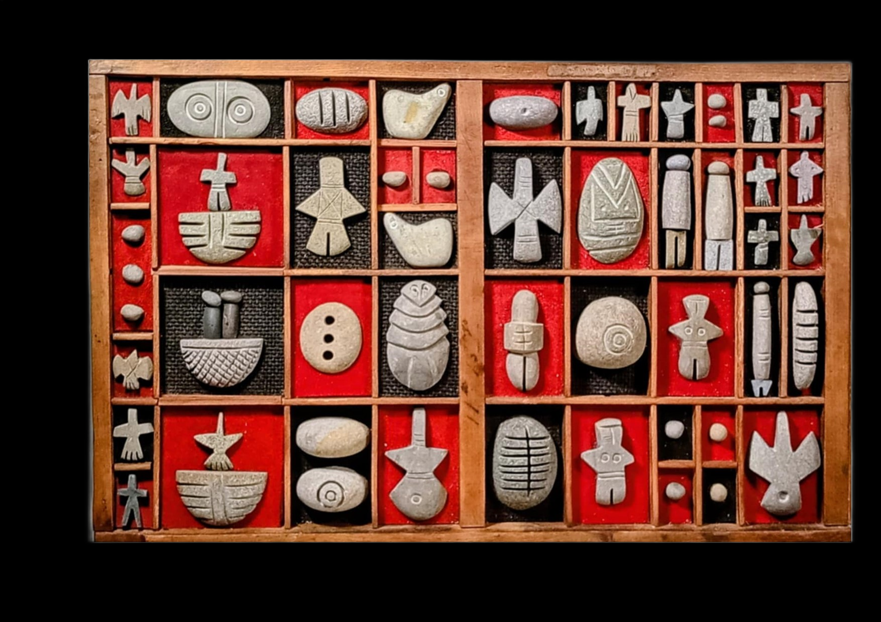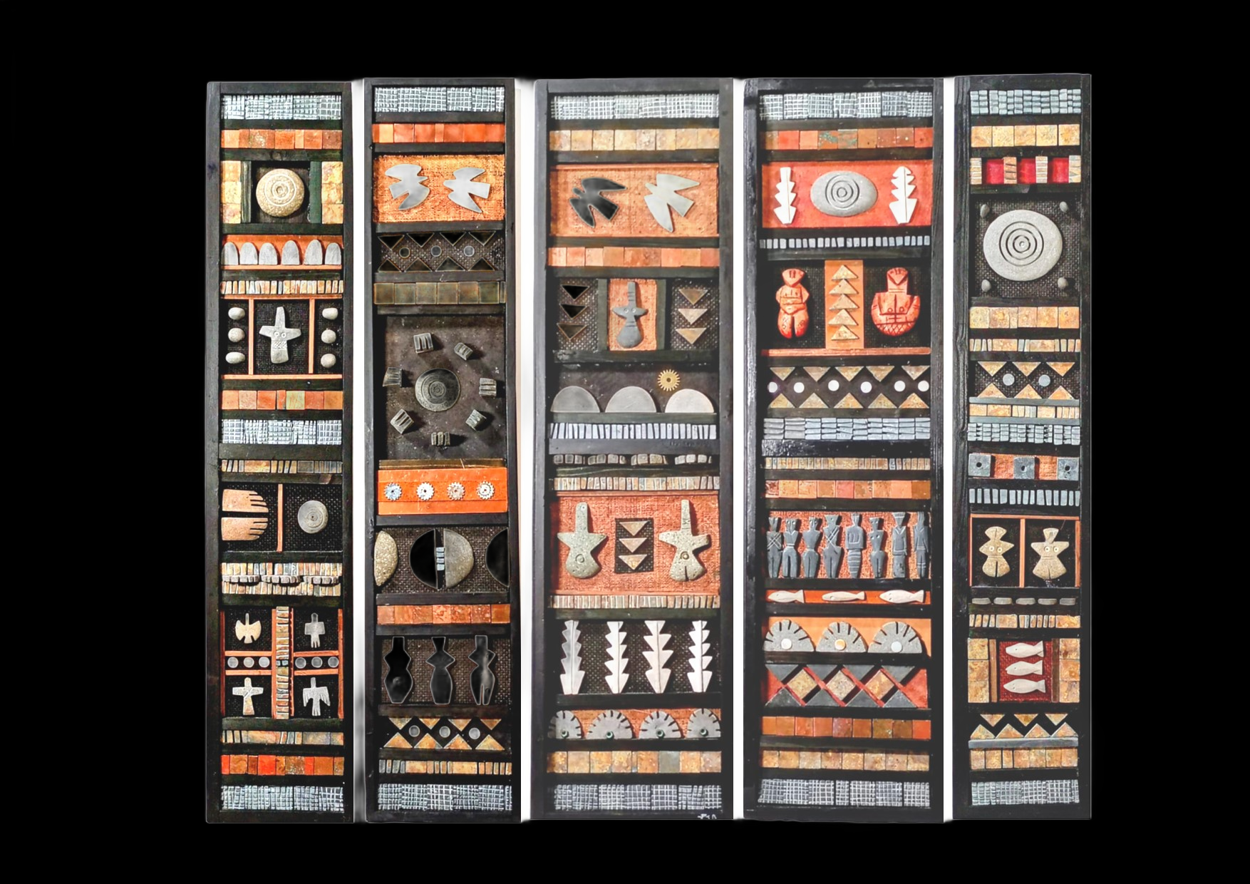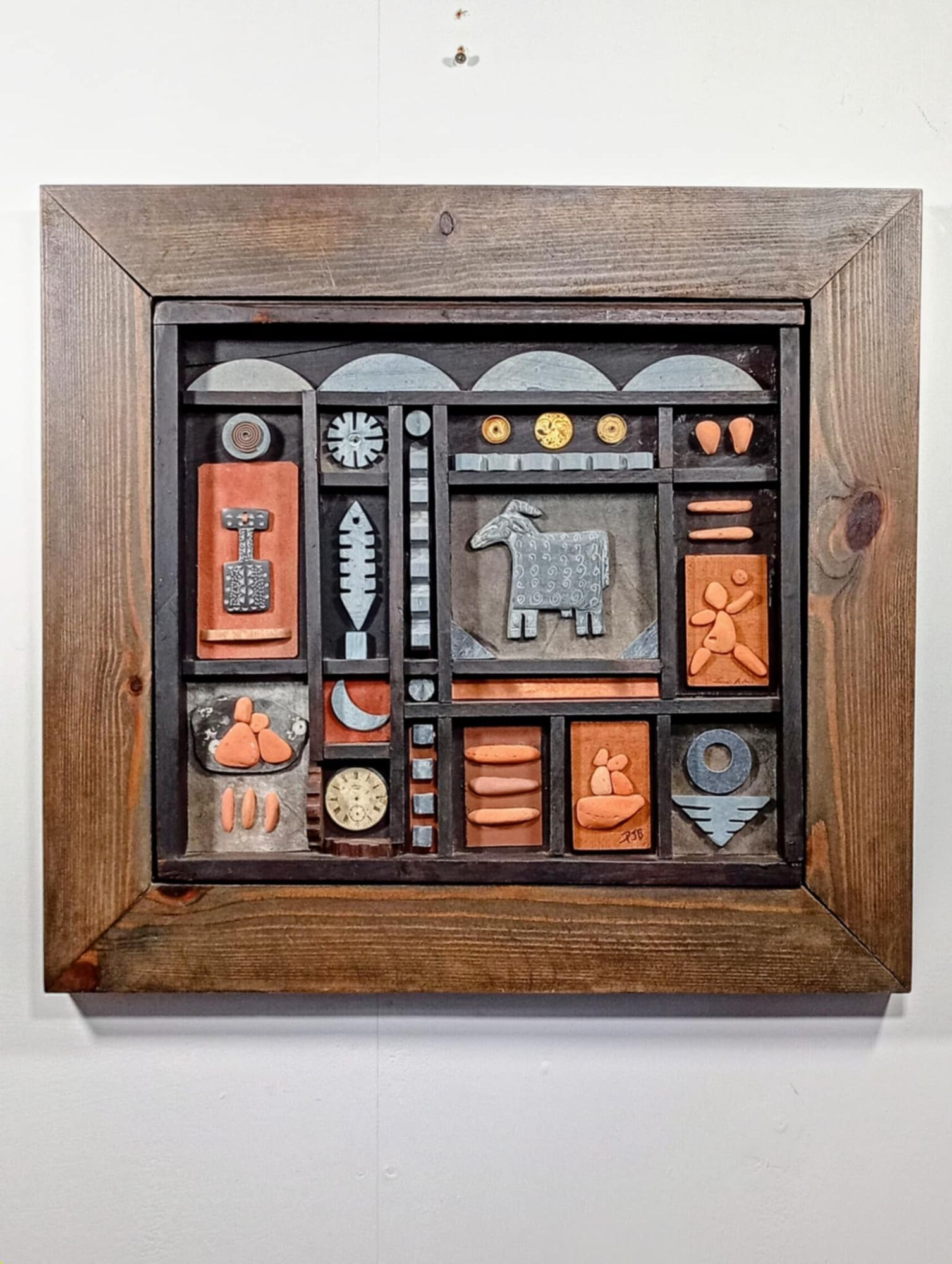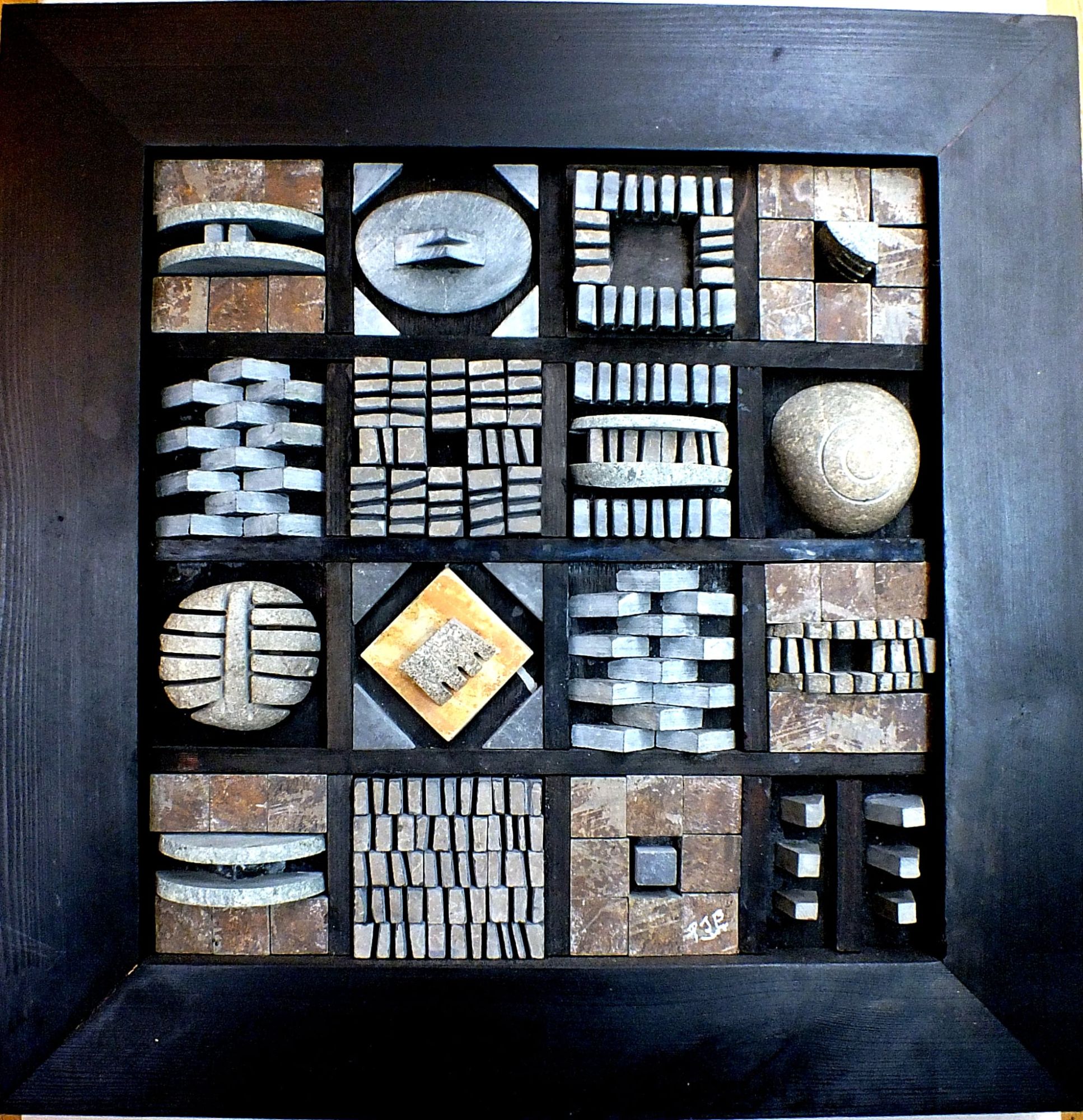 These assemblages are the result of putting together different components, and pieces, I have created out of natural materials such as wood slate, stone, metal and leather, with some added objets trouvés, such as bits of old watches. Each tiny piece is cut, carved, sanded, dyed, textured or patinated. Using a limited palette of carefully chosen colours, I orchestrate the juxtaposition of shape, and textures Intuitively, into these contemporary panels.